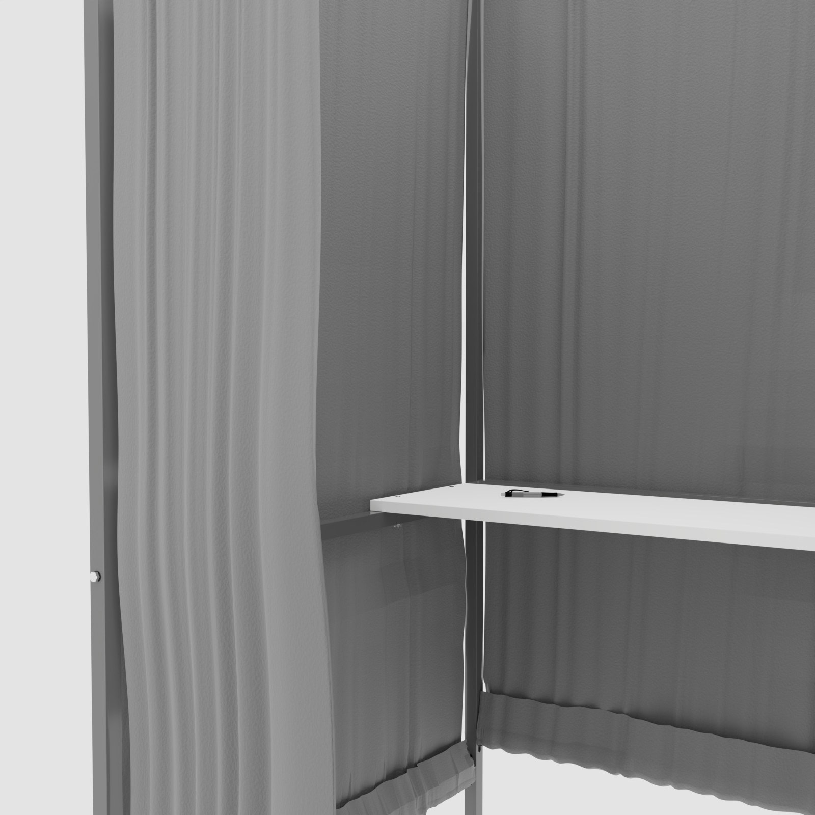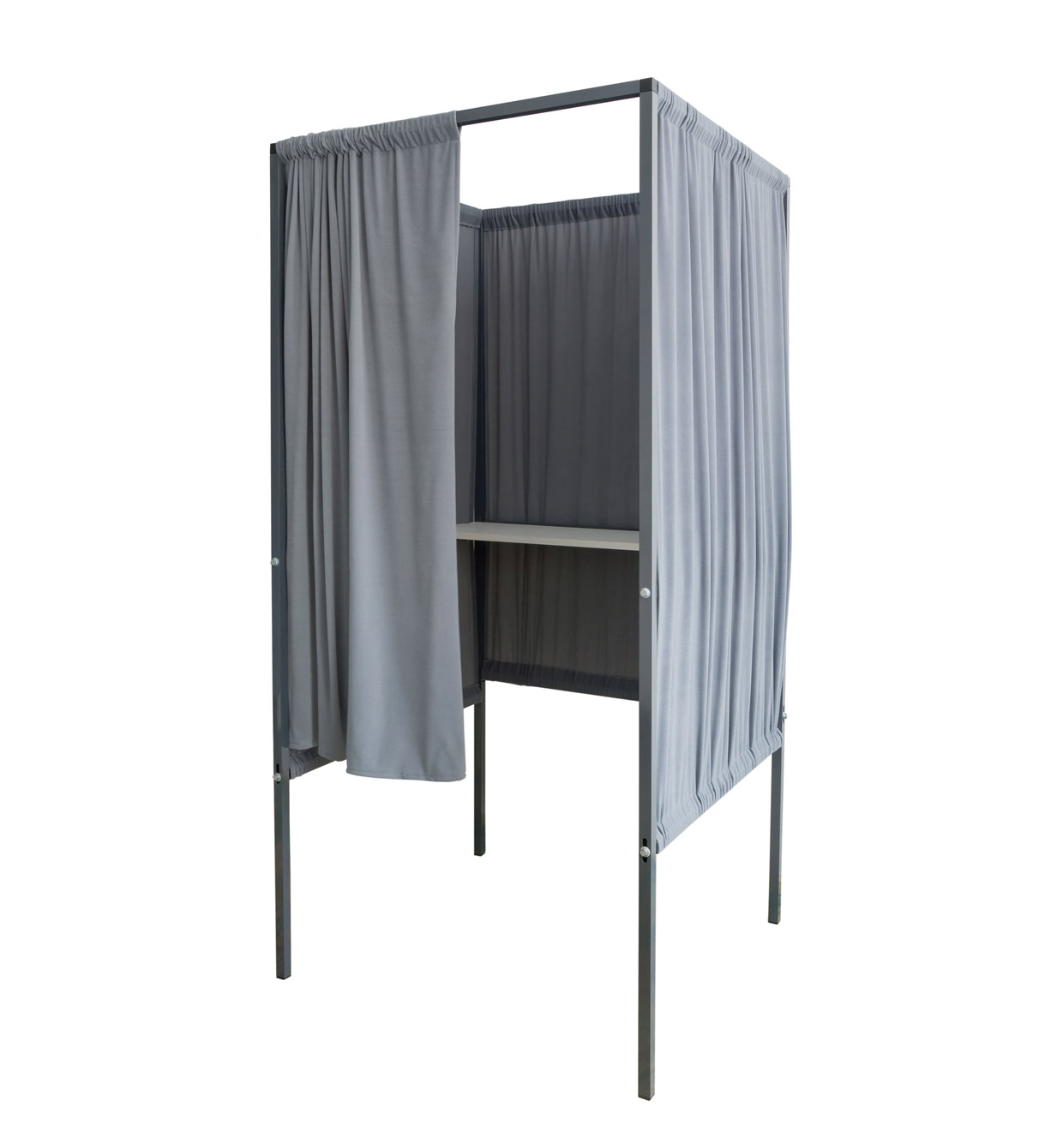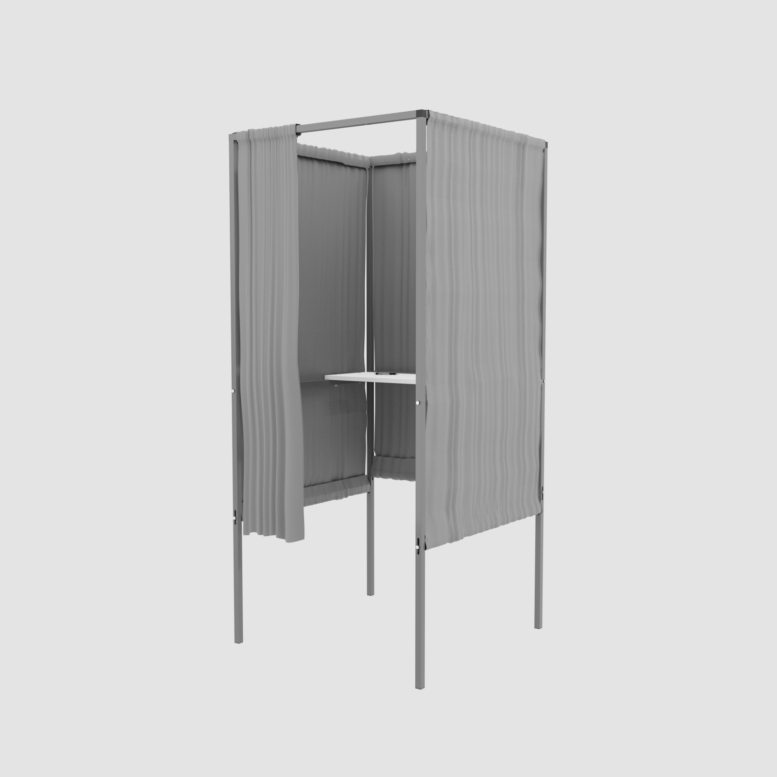 Ścianki kabiny wykonane są z trwałej tkaniny, która skutecznie zapewnia wyborcom prywatność i dyskrecję podczas oddawania głosu. Wewnątrz kabiny znajduje się blat roboczy o szerokości 30 cm, wykonany z laminowanej płyty wiórowej, umożliwiający komfortowe wypełnianie kart do głosowania.